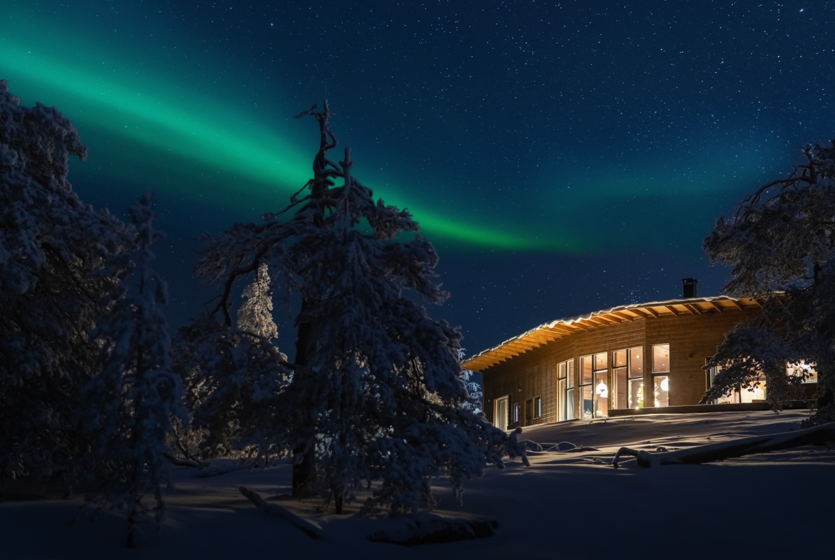 The property, accessible by helicopter, snowmobile or car, is surrounded by silent wilderness and freely roaming reindeers in a light pollution free environment, ideal for the observation of Aurora Borealis