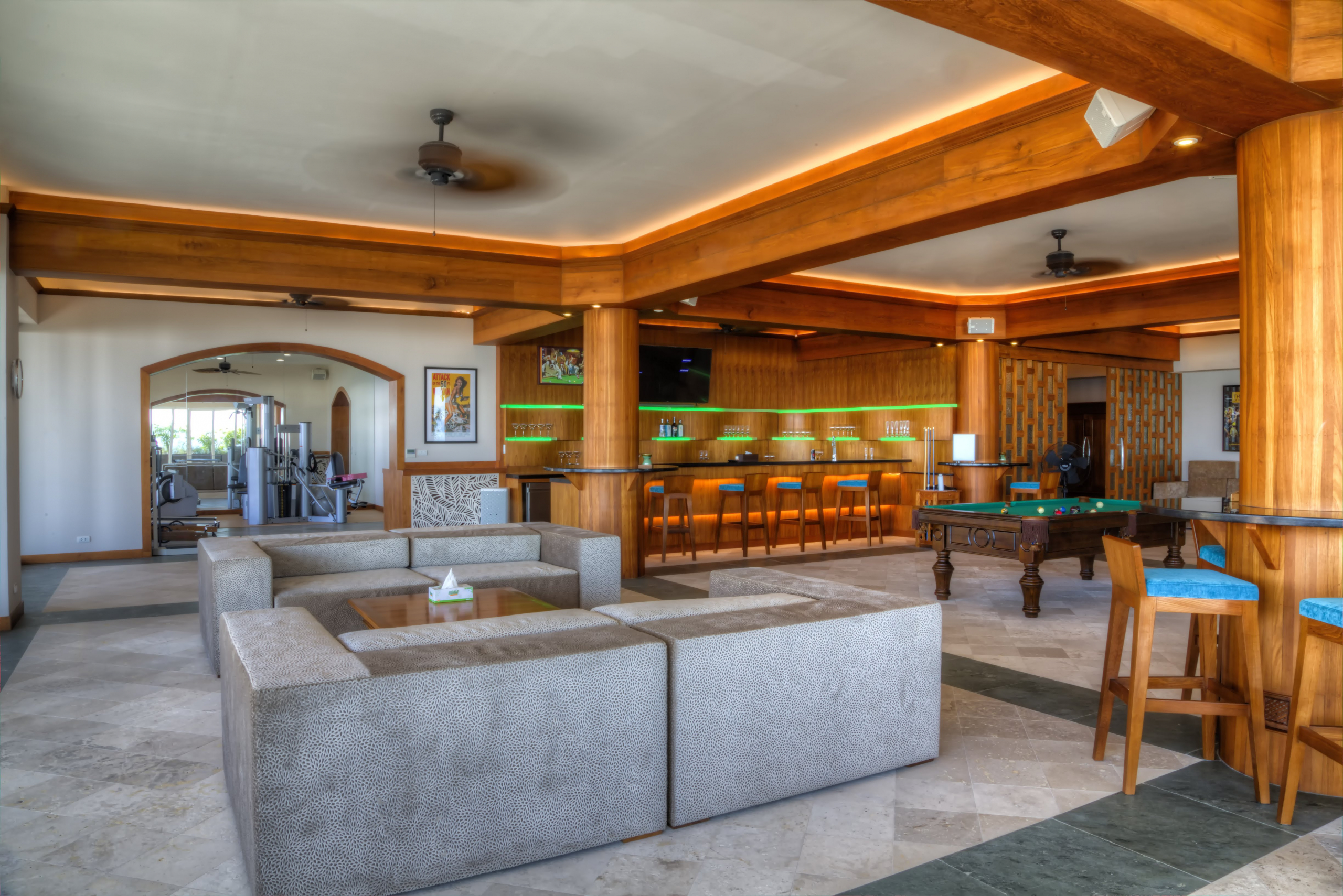 In the third villa, in the southern part of the island, it feels like guests are right over the water, it has 8 bedrooms, games room including pool table, shuffleboard, darts, air hockey, table tennis, board games and a full bar